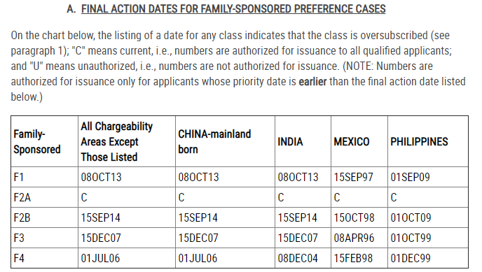 F1(公民的21岁以上未婚成年子女):排期前进47天到了2013年10月8日。